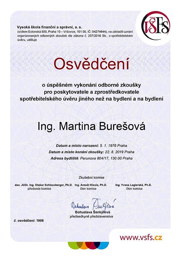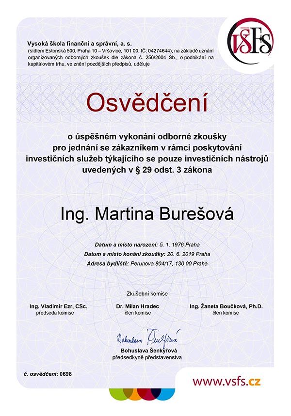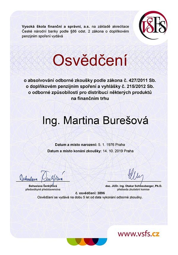 Po vystudování Vysoké školy ekonomické jsem nastoupila do rodinné firmy jako personalistka a specialistka na finance a pojištění. Když jsem pak pomáhala blízké osobě dostat se z dluhů, došlo mi, jak důležité je, aby měli všichni alespoň základní znalosti o financích. Rozhodla jsem se tomuto tématu věnovat naplno a složila jsem všechny povinné zkoušky České národní banky pro finanční poradce. Už více než 3 roky pomáhám klientům nastavit si finance tak, aby dosáhli svých snů a cílů a stabilní finanční situace.